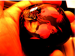 I feel that this rock also show us that anything can be refined, restored, finished and processed with layers and layers of effort, in this case, lacquer. First, it was painted black. Black is a color or strong power and strength. This black-colored rock that I held in my hand had been painted black and then coated with layers of lacquer. Lacquer was applied to the stone to make a finished product. I would never have thought of this rock as being inanimate, something that had no power and no sense of history. I would have just overlooked it. Now, when you look at it, it’s beautiful. It symbolizes a gemstone. It is a stone that has been through many types of obstacles and troubles, even times of war. Perhaps someone had fallen upon this rock, or someone had rested there to take a drink of water, but never taken time to look at it and say, I’m going to take this rock and make a difference. This rock symbolizes change. We can all be made to be something different, something more beautiful if we just apply time.