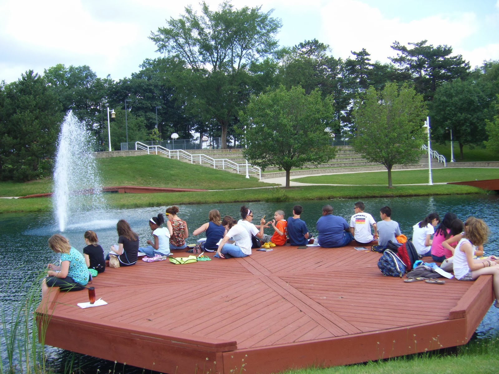 Inkstains summer writing camp is: sitting in the cool shadow of a tall sculpture during a writing marathon, pencil scribbling across the page of your marbled covered notebook; hearing the click clack of keyboards blogging away, posting writing, and cheering other writers on; feeling the warm applause of camp friends, family members, and teachers as you stand before them to proudly read your published piece.